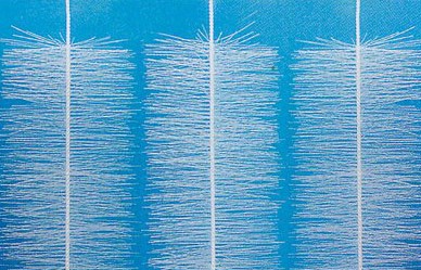 彈性立體填料篩選了聚烯烴類和聚酰胺中的幾種耐腐、耐溫、耐老化的優(yōu)質(zhì)品種,混合以親水、吸附、抗熱氧等助劑,采用特殊的拉絲,絲條制毛工藝,將絲條穿插固著在耐腐、高強(qiáng)度的中心繩上,由于選材和工藝配方精良,剛?cè)徇m度,使絲條呈立體均勻排列輻射狀態(tài),制成了懸掛式立體彈性填料的單體,填料在有效區(qū)域內(nèi)能立體全方位均勻舒展?jié)M布,使氣、水、生物膜得到充分混滲接觸交換,生物膜不僅能均勻的著床在每一根絲條上,保持良好的活性和空隙可變性,而且能在運(yùn)行過(guò)程中獲得愈來(lái)愈大的比表面積,又能進(jìn)行良好的新陳代謝,這一特征與現(xiàn)象是國(guó)內(nèi)目前其他填料不可比擬的。